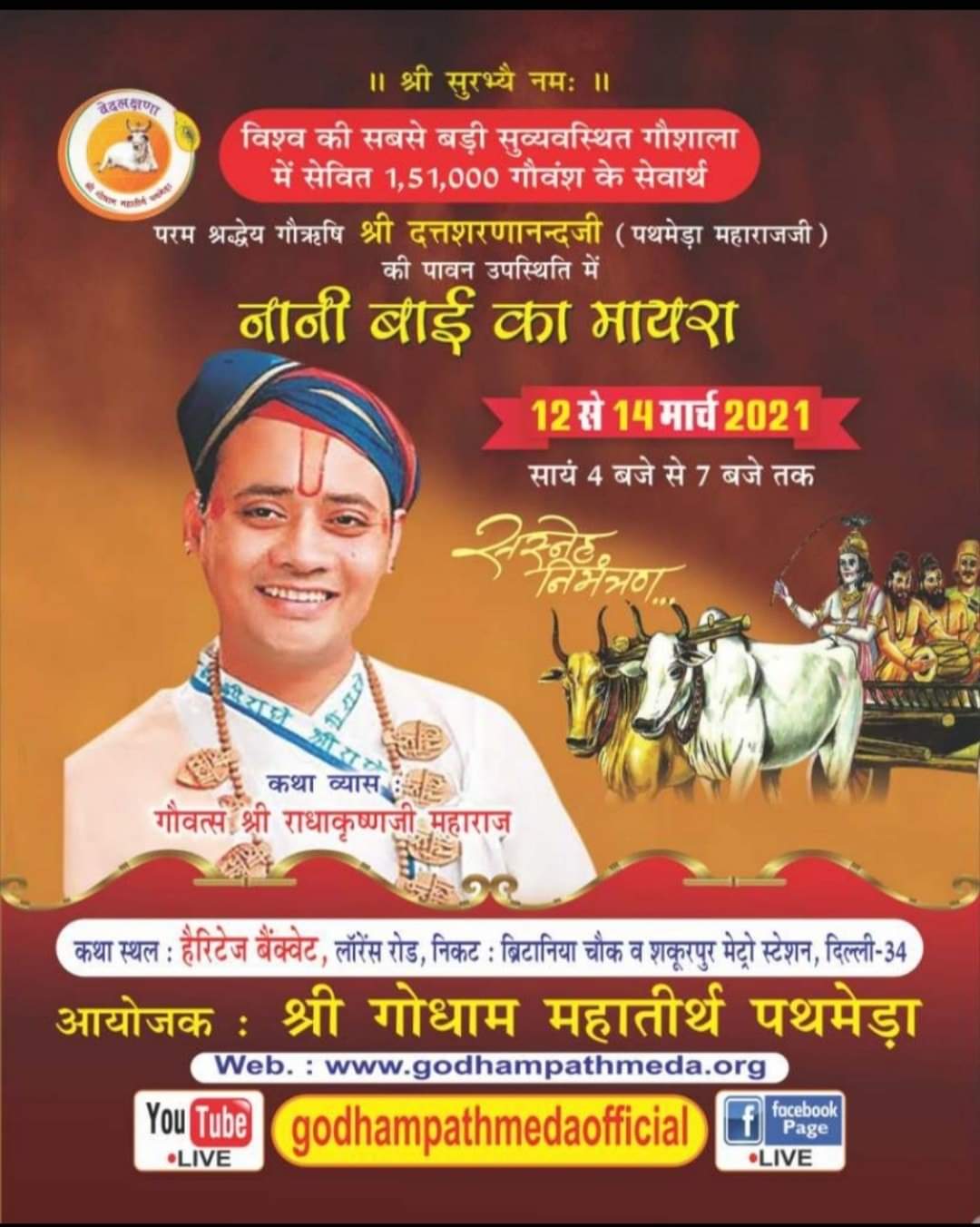 श्री गोधाम महातीर्थ पथमेड़ा के संस्थापक श्रद्धेय गोऋषि स्वामी श्री दत्तशरणानंदजी महाराज के पावन सानिध्य में आयोजित वेदलक्षणा गोप्रसाद यात्रा के अन्तर्गत दिल्ली महानगर में गोवत्स श्री राधाकृष्णजी महाराज के मुखारविंद से नानी बाई रो मायरो कथा में आप सभी सादर आमंत्रित हैं।