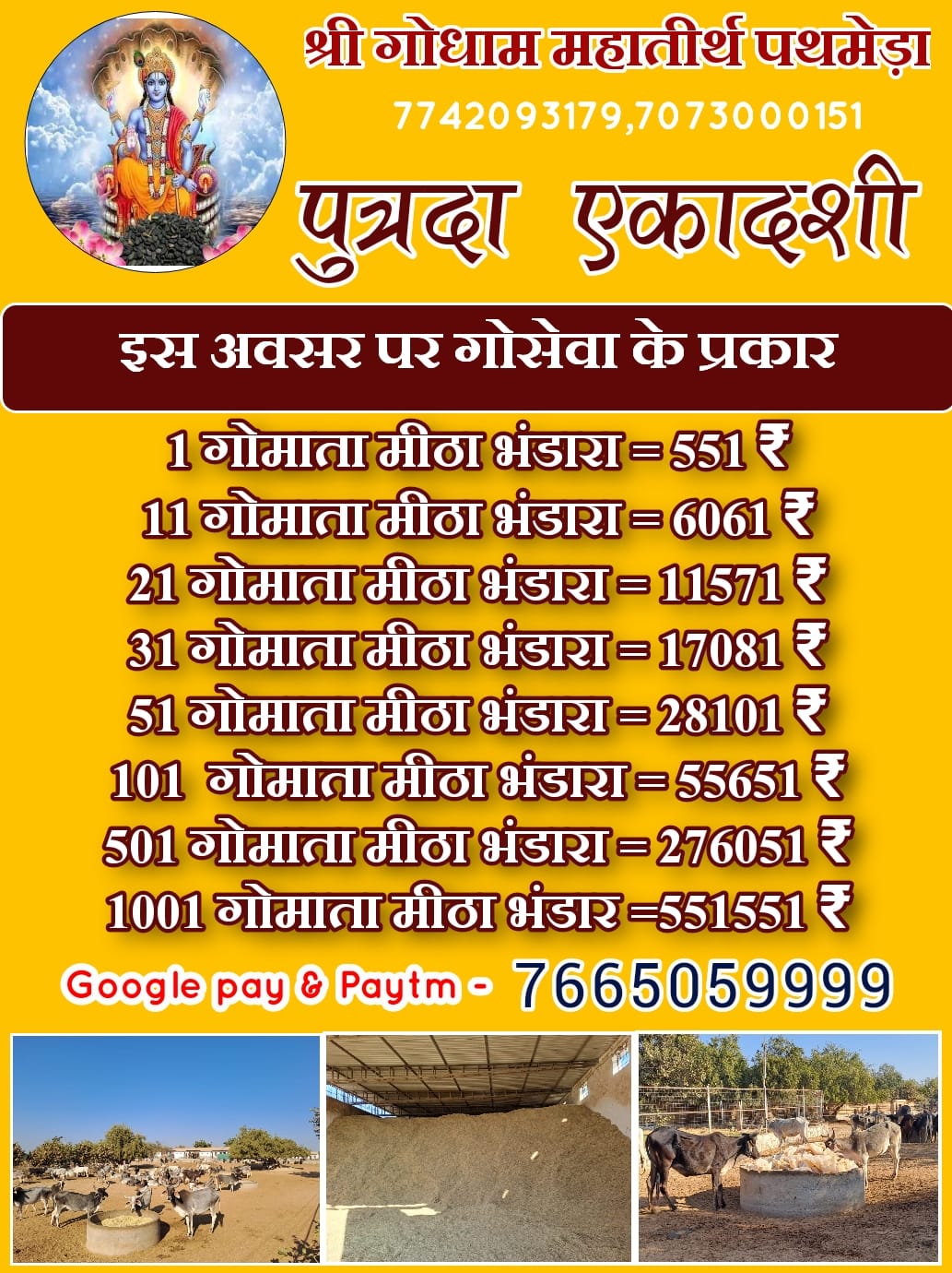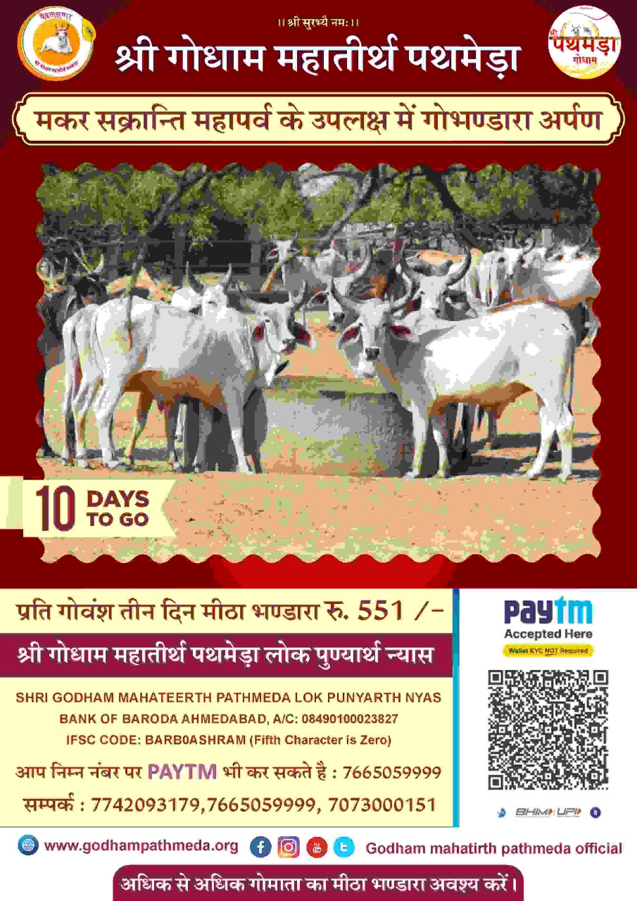 10 दिन बाद आने वाले महान दानपर्व मकरसंक्रांति के अवसर पर श्रद्धेय गोऋषि स्वामी श्री दत्तशरणानंदजी महाराज द्वारा स्थापित एवं संचालित 64 से अधिक गोसेवा प्रकल्पों में पुज्य भाव से सेवित 1 लाख 51 हजार से अधिक निराश्रित गोवंश के मीठे भण्डारे के महाभियान में जन जन को जोड़ने के महनीय कार्य में हम स्वयं करें और सभी से करवायें।